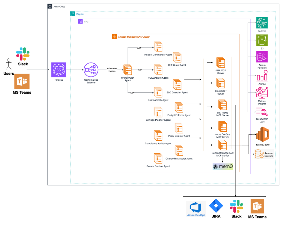 Amazon EKS/ECS – Orchestration of agent-based DevOps workflows.