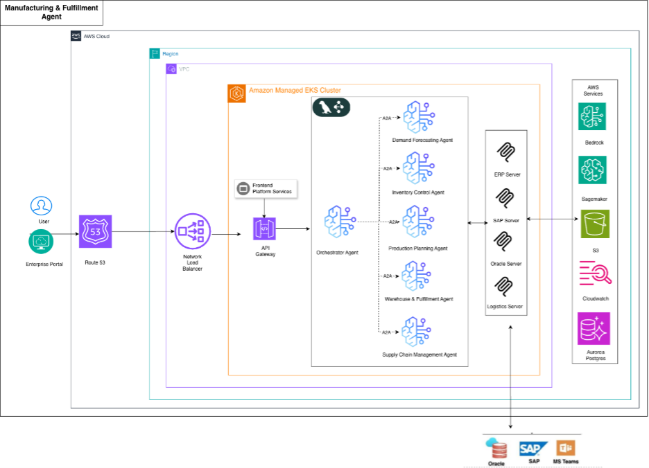 The enterprise implemented the Manufacturing & Fulfillment Multi-Agent Platform on AWS as an AI-native multi-agent solution for end-to-end order fulfillment optimization. The solution functions as a centralized AI orchestration layer deployed within an Amazon EKS cluster, where specialized agents handle domain-specific functions and communicate via Agent-to-Agent (A2A) protocol.