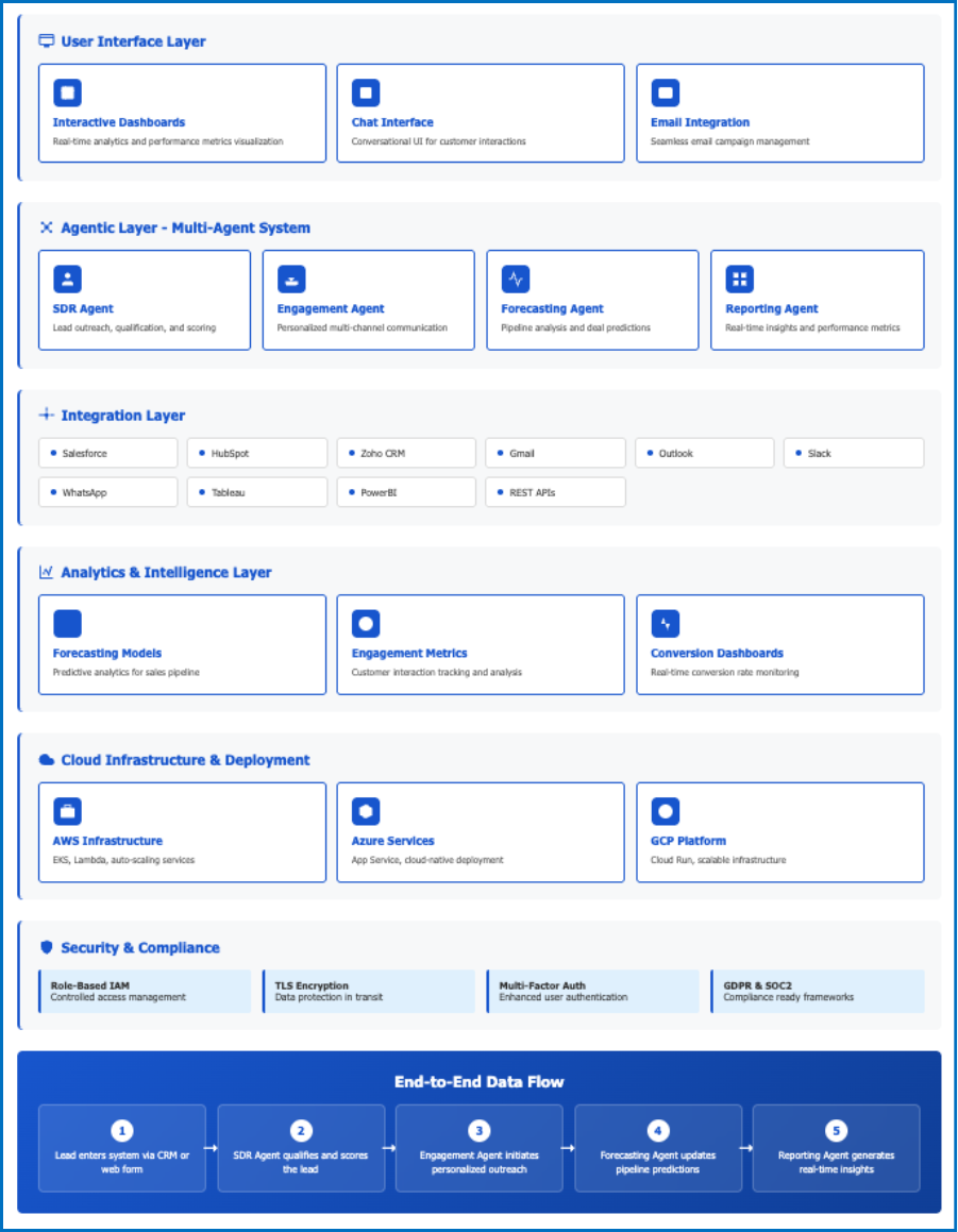 Agent Force was deployed as an autonomous multi-agent platform for sales and customer engagement. Leveraging SDR, Engagement, Forecasting, and Reporting Agents, the platform unified CRM workflows and automated the entire sales journey from lead qualification to deal closure.
