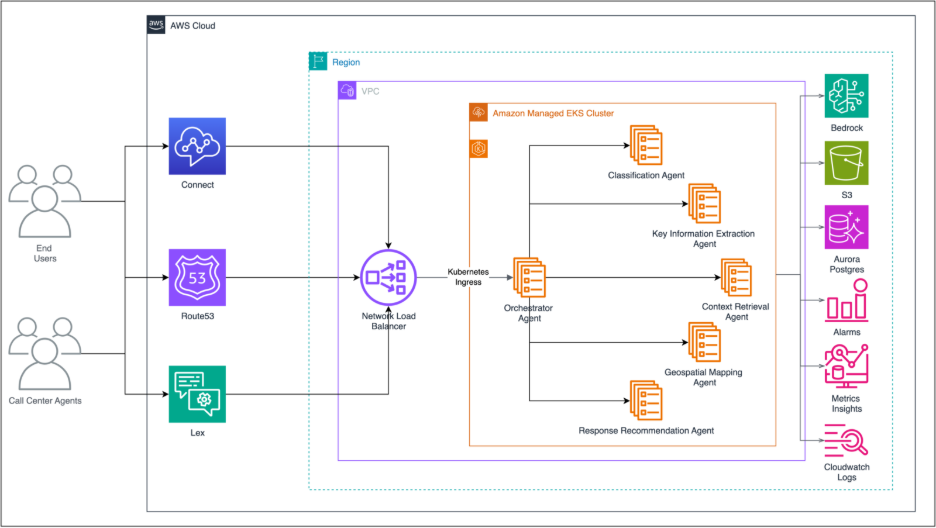 The AWS partner built a multi-agent AI orchestration on AWS to tackle these challenges. The solution deploys a supervisor agent (using Amazon Bedrock Agents) that oversees multiple specialized sub-agents, each responsible for tasks like incident classification, resource recommendation, or report generation. Calls and messages are handled via Amazon Connect (cloud contact center), using Amazon Lex to interpret caller intent. The AI agents then automatically gather details (location, severity, assets needed) and format a CAD-compliant incident report.